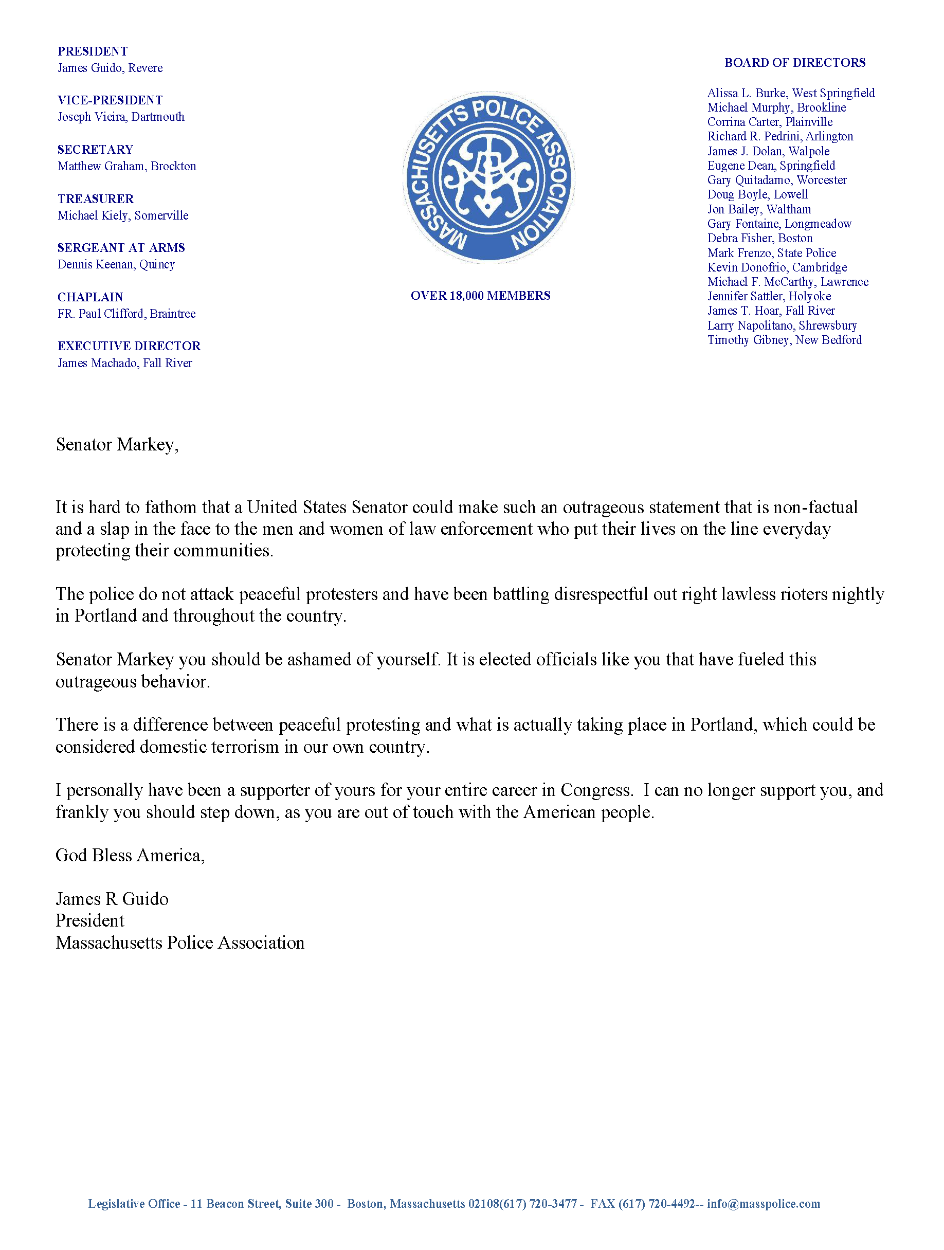 The Massachusetts Police Association’s Executive Director Jim Machado works tirelessly to ensure that the voice of the association is heard on Beacon Hill. Jim is well respected and has been instrumental in ensuring our primary goals are communicated to the State Delegation. On this page you will find the latest news from Beacon Hill. Jim is constantly updating the association with breaking news that is pertinent to not only active police officers but also retired.